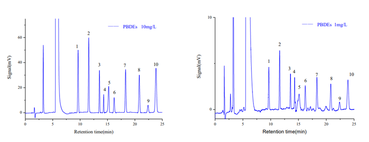 Figure 2. Chromatograms of the polybrominated biphenyl ether (PBDEs) standard with concentration of 10mg/L and 1mg/L.