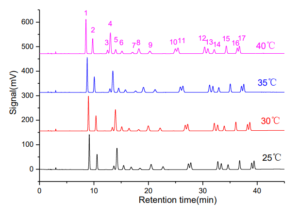 Figure 1-1. Overlay chromatograms of 16 PAHs at different temperatures (25, 30, 35, 40°C)