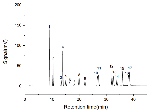 Figure 2. Typical chromatogram of 16 PAHs and decafluorobiphenyl standard (peak 7)