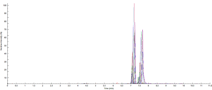 Figure 1. MRM over-lay chromatograms of the 36 compounds at 50 ng/mL