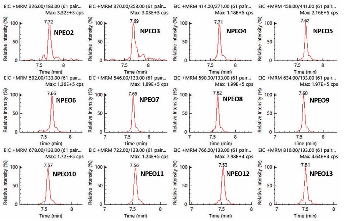 Ionization mode:ESI positive for ethoxylates, ESI negative for alkylphenols (polarity switching)