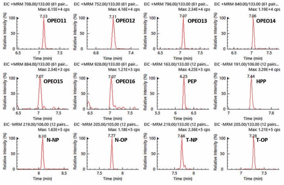The MRM chromatograms of the 36 compounds at 50 ng/mL are shown in Figure 1, and Figure 2 displays individual MRM chromatograms.. All peaks are well-shaped and baseline separated, with sufficient data points for accurate quantification. Polarity switching allows simultaneous detection of both APEOs (ESI+) and APs (ESI-) in a single run.