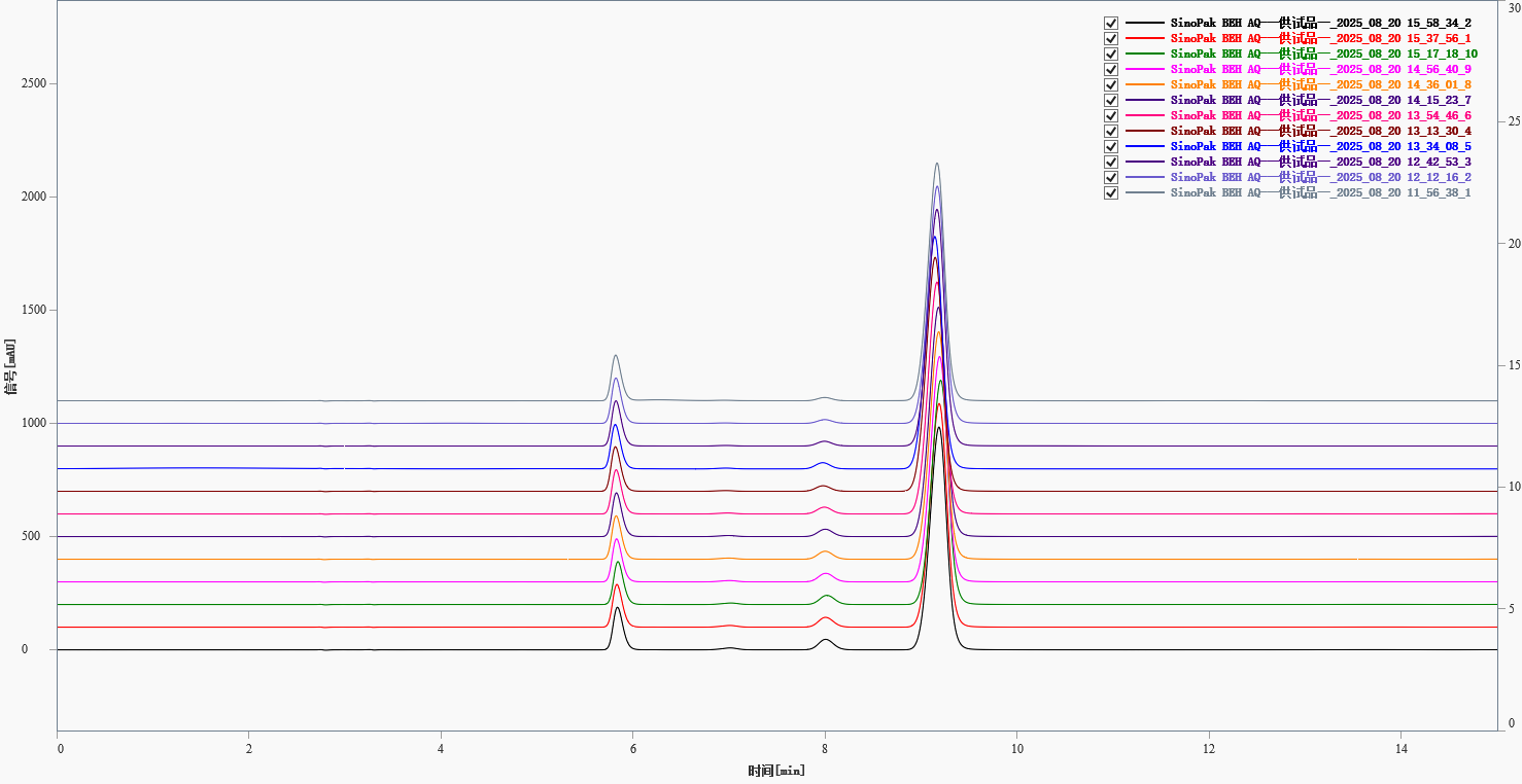 The sample solution was injected ten times consecutively (Figure 2). The retention time RSDs for the four peaks were below 0.33%, indicating excellent system precision. Note that peaks 2 and 3 (retention times ~6.95 and 7.99 min) showed increasing peak areas over time (possibly due to instability), so their area RSDs were not calculated. Detailed data are given in Table 2.