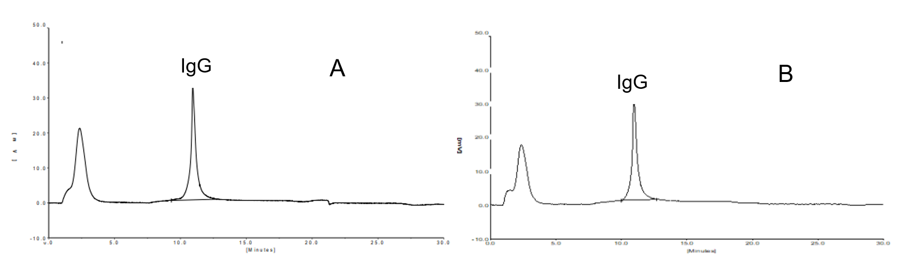 Typical chromatograms of bovine colostrum powder samples A and B are shown in Figure 1. The IgG peaks are well resolved with retention times of approximately 10.94 min. Chromatographic parameters are summarized in Table 2.