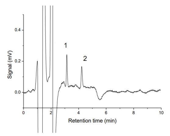 Figure 1. Typical chromatogram of methomyl oxime (peak 1) and methomyl (peak 2) standards (5 μg/L)