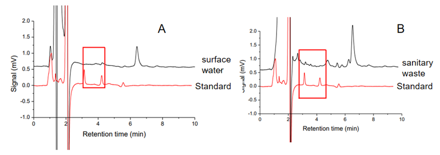 Figure 2. Chromatogram of (A) surface water sample and (B) sanitary waste.