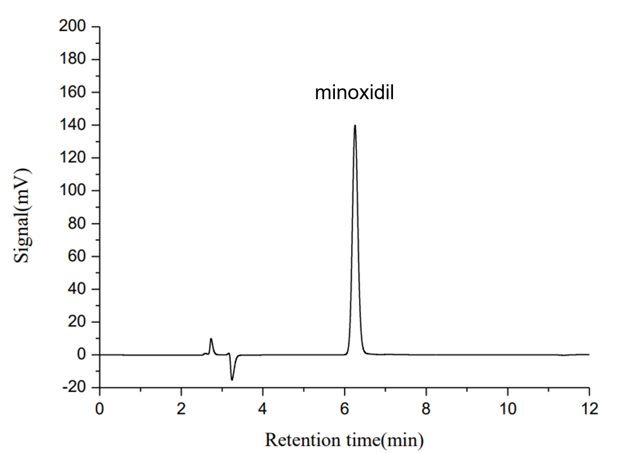 A typical chromatogram of a 20.0 mg/L minoxidil standard is shown in Figure 1-2 (refer to original document). The retention time is approximately 6.26 min, with an asymmetry factor of 1.13 and a theoretical plate number of 38,100 N/m, indicating good peak shape and column efficiency.