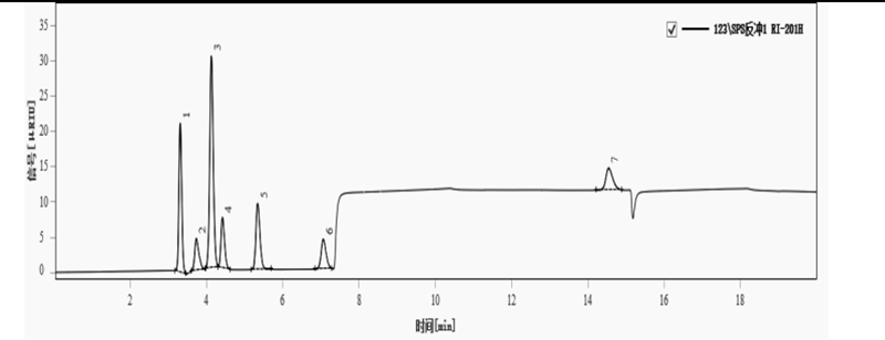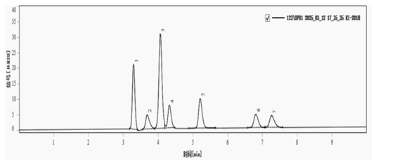 After system equilibration, 20 μL of the SPS system performance verification standard solution was injected. As shown in Figure 1 and Table 3, all seven compounds were baseline separated with good peak shapes.