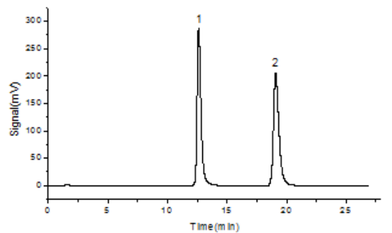 Fig. 1. Chromatogram of ciprofloxacin lactate (peak 1) and enrofloxacin(peak 2)