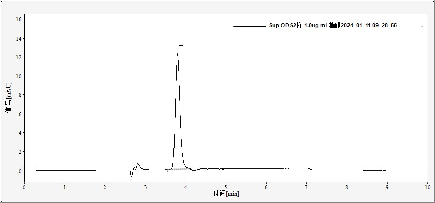 A 1.0 μg/mL furfural standard solution was analyzed under the above conditions. The chromatogram is shown in Figure 1. Chromatographic parameters are summarized in Table 1.The analysis is rapid and the column efficiency is satisfactory.