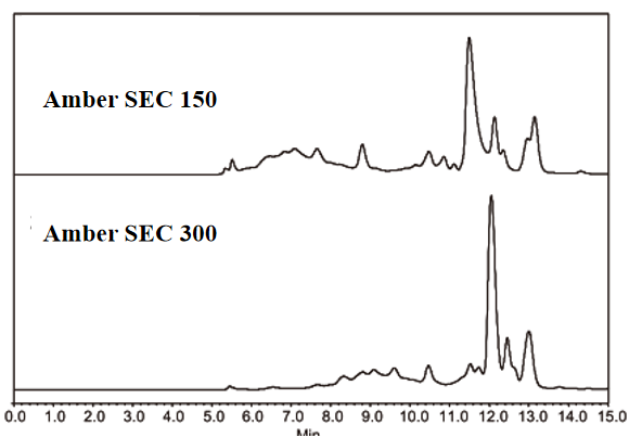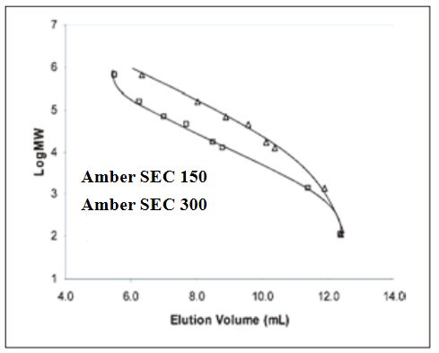 | Amber SEC 300 | 3 | 300 | 5,000 ‒ 1,250,000 | 1,000-100,000 | 2 ‒ 8.5 | 20 mM - 2.0 M |