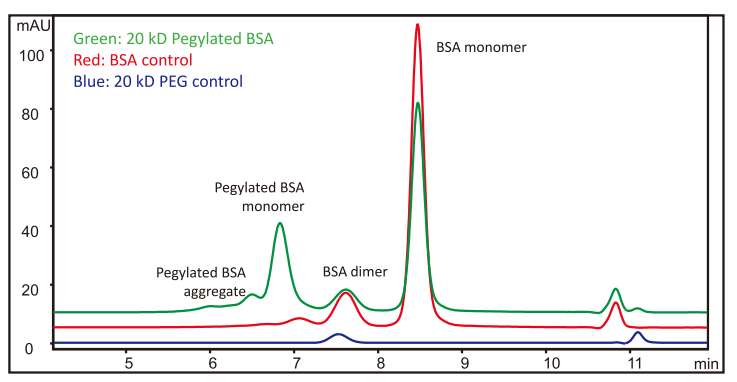 Sample: BSA control (5mg/mL in Sodium acetate),10 μLPEG 20 kD,10 mg/mL,5μ L20 kD Pegylated BSA,4.23 mg/mL,12μL
