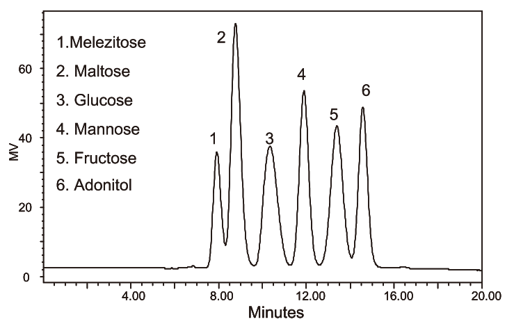 The availability of multiple selectable ion forms for Amber Sugar resins enables the Amber Sugar series columns to be widely used for the separation of sugar molecules, sugar alcohols and other water-soluble substances in various matrices. For example, arabinose, ribitol and arabitol are difficult to separate on H-form columns, yet achieve baseline separation on Ca-form columns; xylose, galactose and mannose elute as an overlapping peak on Ca-form columns, while they can be eluted sequentially as individual peaks on Pb-form columns.