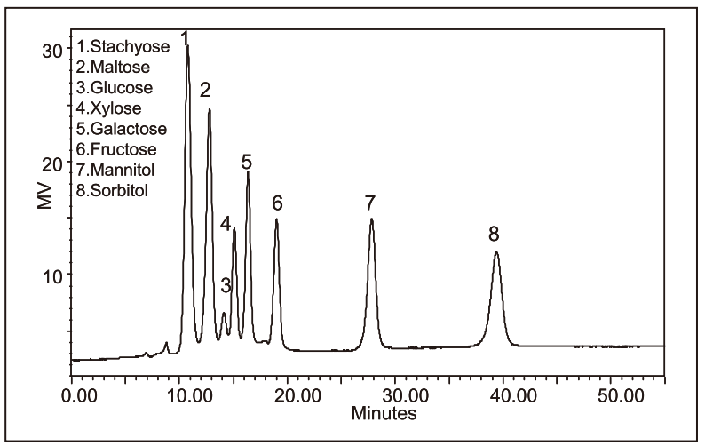The availability of multiple selectable ion forms for Amber Sugar resins enables the Amber Sugar series columns to be widely used for the separation of sugar molecules, sugar alcohols and other water-soluble substances in various matrices. For example, arabinose, ribitol and arabitol are difficult to separate on H-form columns, yet achieve baseline separation on Ca-form columns; xylose, galactose and mannose elute as an overlapping peak on Ca-form columns, while they can be eluted sequentially as individual peaks on Pb-form columns.