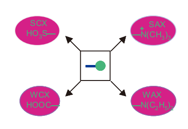 There are four types of ion exchange stationary phases: strong cation exchange (SCX), weak cation exchange (WCX), strong anion exchange (SAX), and weak anion exchange (WAX). Amber SCX, WCX, SAX and WAX stationary phases are formed by covalently bonding sulfonic acid groups, carboxylic acid groups, quaternary ammonium groups and tertiary amine groups to the surface of the hydrophilic coating on non-porous PS/DVB resins, respectively.