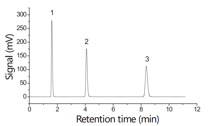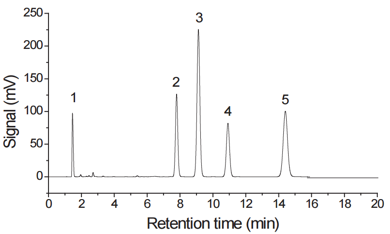- Test compounds: 1. Uracil, 2. Butylbenzene, 3. Terphenyl, 4. Pentylbenzene, 5. Triphenylene