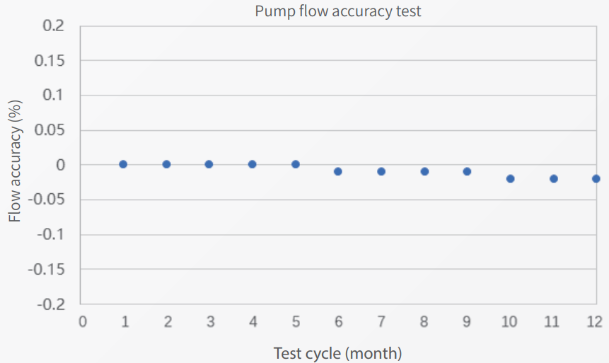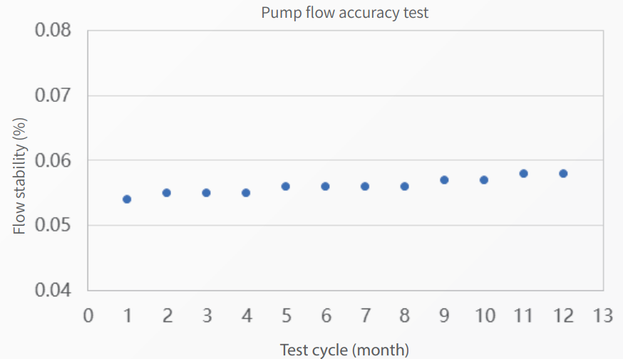 Pump flow accuracy: during the 12-month test period, the flow accuracy of the P1100+ high-pressure constant-flow pump ranged from -0.02% to 0, demonstrating the pump's excellent flow stability, which ensures the reliability of the test results.