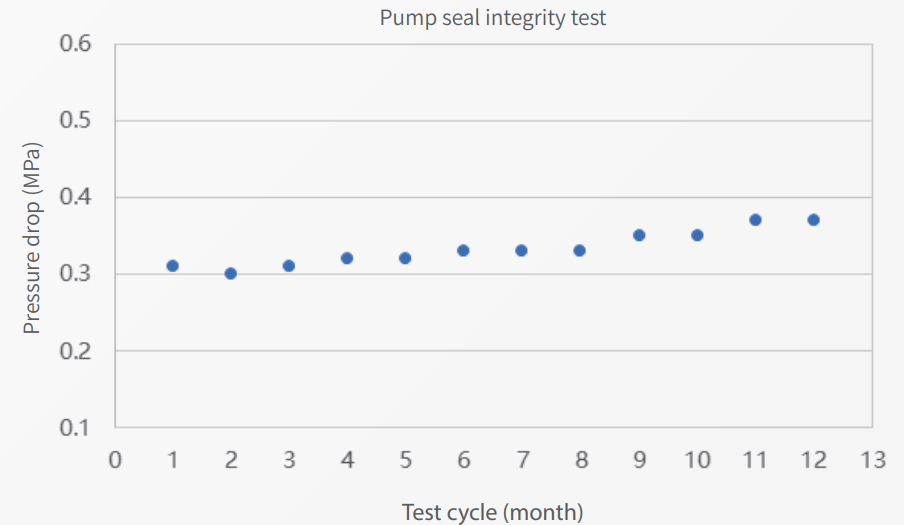 Pump seal integrity: during the 12-month test period, the pressure drop of the P1100+ high-pressure constant-flow pump ranged from 0.31 MPa to 0.37 MPa, demonstrating the pump's high quality, which ensures durability and reliability over prolonged operation.