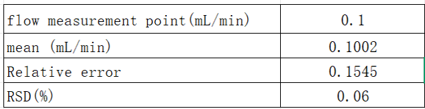 Improved stability: Excellent accuracy and stability are maintained even at low flow rates, 0.1 mL/min. Using deionized water as the mobile phase, 11 consecutive sets of values were recorded at a flow rate of 0.1 mL/min with a digital flow meter, and the mean value and RSD value were calculated.